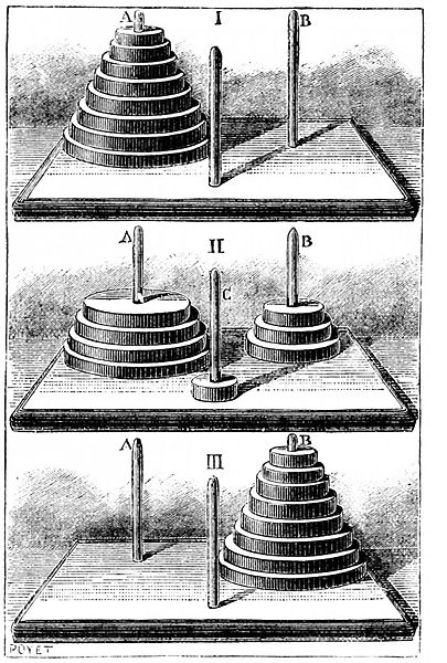 An old legend tells of a Hindu temple where the pyramid puzzle might have been used for the mental discipline of young priests. The legend says that at the beginning of time, the priests in the temple were given a stack of 64 gold disks, each one a little smaller than the one beneath it. Their assignment was to transfer the 64 disks from one of three poles to another, with one important rule: a large disk can never be placed on top of a smaller one. The priests worked very efficiently, day and night. When they finished their work, the myth said, the temple would crumble into dust, and the world would vanish.